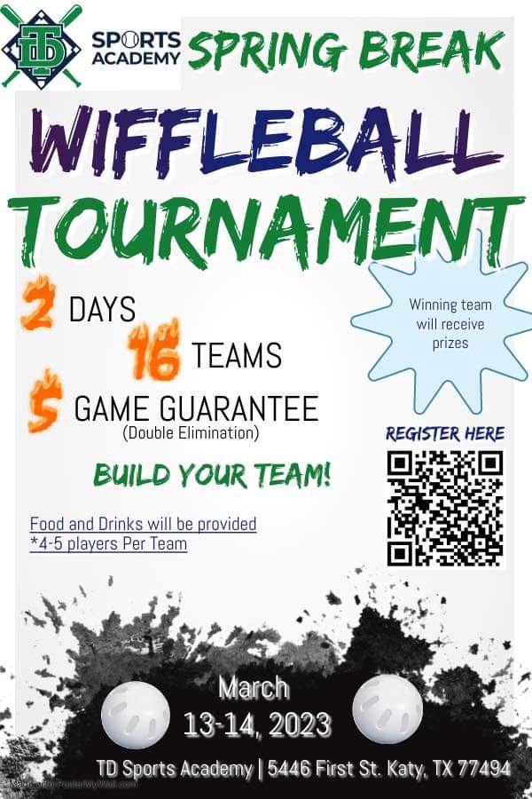 TD Sports Academy - Spring Break WIFFLE Ball Tournament (Day 1) Where: Katy, TX When: 3/13/23 - 3/14/23 Registration